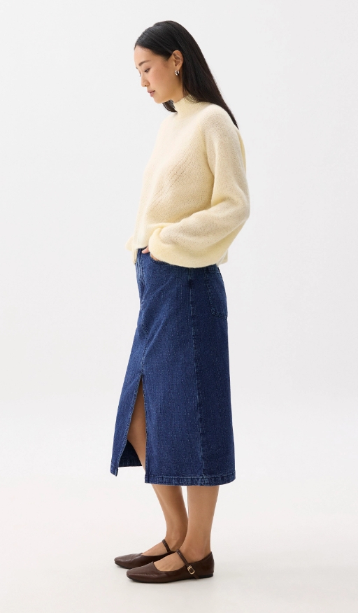 Show a little skin and a lot of sass in this edgy denim number. Designed with a calf skimming length and finished off with a front slit that’s just enough to keep ’em guessing. Comes with functional pockets and a front fly closure.